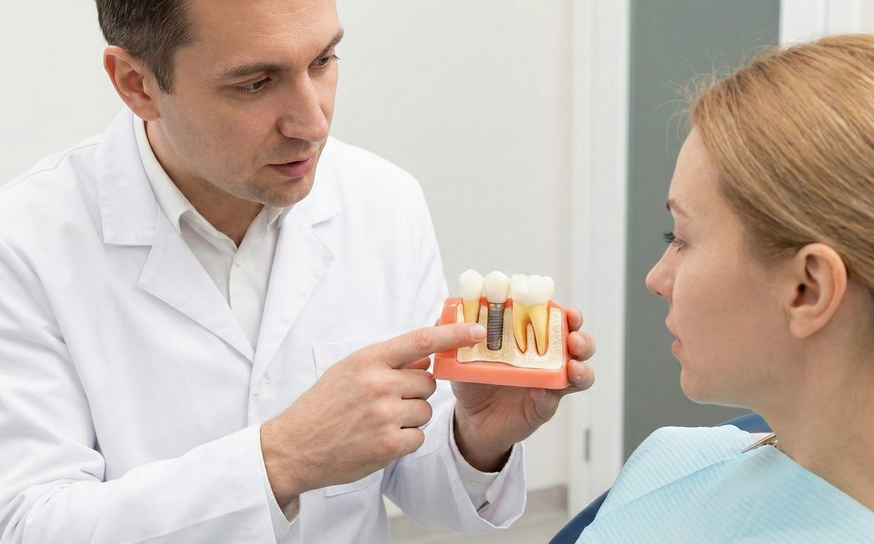 A dental implant is a titanium post surgically placed into the jawbone to replace the root of a missing tooth. Once it fuses with the bone through a process called osseointegration, a custom crown is attached on top. The result is a stable, permanent restoration that looks and functions like a natural tooth.