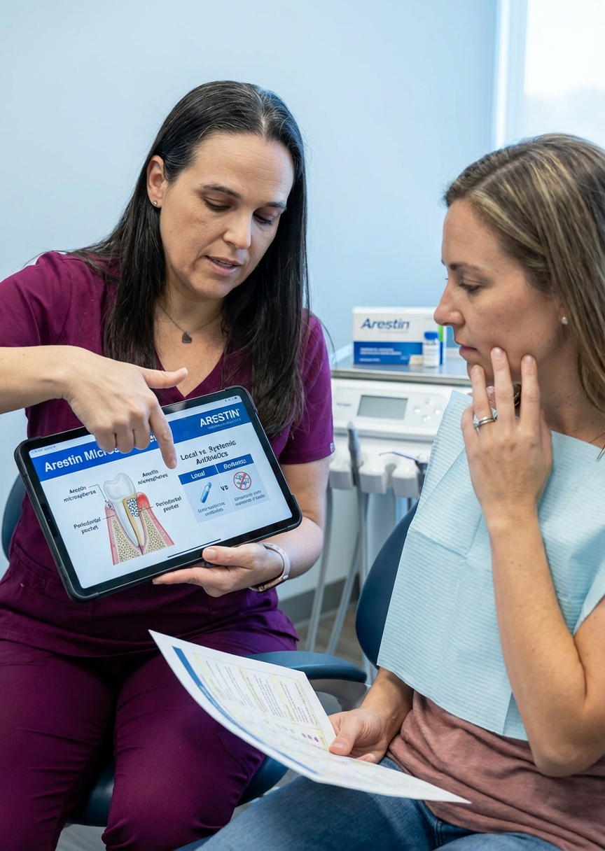 Arestin is especially useful for isolated trouble spots that need additional support beyond traditional deep cleaning. By lowering bacterial levels and calming inflammation, it can help stabilize gum health, reduce pocket depth over time, and support long term periodontal maintenance.